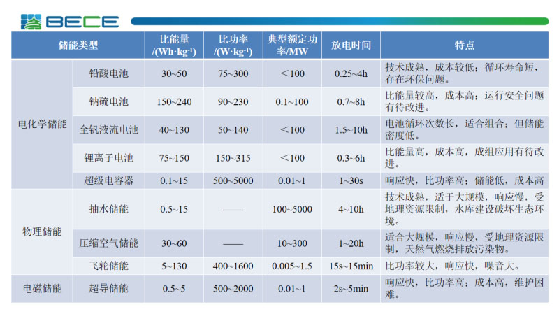 儲能技術(shù)的分類,物理儲能、電磁儲能、電化學(xué)儲能和相變儲能。這是它們的特性表,可能大家都比較熟了,通過典型的額定功率我們可以看出來抽水蓄能現(xiàn)在還是適合大規(guī)模建設(shè),依然是現(xiàn)在儲能系統(tǒng)的主力軍。從比功率來看,超級電容占優(yōu)勢,它的響應(yīng)速度快,比功率高,所以大部分被用在電能質(zhì)量的治理和電壓暫降的治理方面。從比能量方面來看可以看到鋰離子電池是占優(yōu)的,同時因為鋰離子電池的集成化和布點的靈活性,在電力系統(tǒng)儲能也得到了廣泛的應(yīng)用。