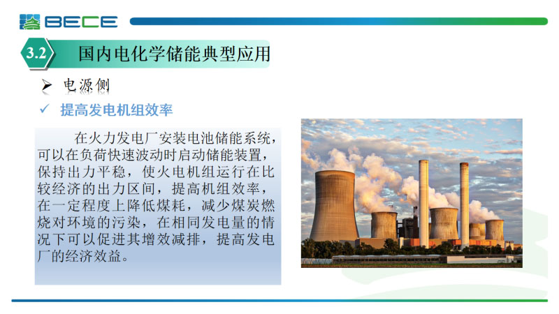 在國內(nèi)電化學(xué)儲能應(yīng)用在電源側(cè)主要體現(xiàn)在提高發(fā)電機組的效率,當(dāng)負荷波動的情況下,我們可以很好的保持發(fā)電機組的輸出穩(wěn)定,使發(fā)電機組運行在一個經(jīng)濟的出力區(qū)間,提高機組的效率,降低機組的能耗,減少機組的排放,提高機組綜合的發(fā)電經(jīng)濟效益。