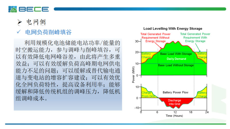 電網(wǎng)側(cè)的主要應(yīng)用場景第一是電網(wǎng)負荷削峰填谷,利用的還是儲能系統(tǒng)的功率和能量的時空搬運能力,削峰填谷,一是可以實現(xiàn)峰谷差的套利,第二可以有效緩解負荷高峰期電網(wǎng)供電能力不足的問題,緩解電網(wǎng)的擴建增容的問題。同時我們可以優(yōu)化電網(wǎng)的負荷特性,提高設(shè)備的利用率,最終還是降低傳統(tǒng)機組的調(diào)峰壓力,降低我們的調(diào)峰成本。