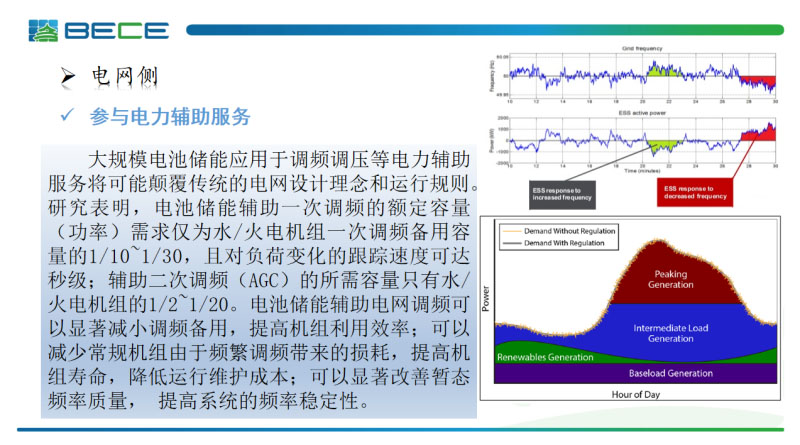 第二個電網(wǎng)側(cè)應(yīng)用是參與電力系統(tǒng)的輔助服務(wù)。電池儲能系統(tǒng)的一次調(diào)頻容量是水電或者火電容量配置的十分之一到三十分之一,而且系統(tǒng)的負荷跟蹤速度可以達到秒級。參加輔助二次調(diào)頻所需的容量是水電火電機組的二分之一到二十分之一,電池儲能系統(tǒng)參與電網(wǎng)的輔助調(diào)頻可以顯著減少系統(tǒng)調(diào)頻的備用容量,提高機組的利用率,同時可以避免機組頻繁的調(diào)節(jié)造成的損耗,降低機組的運行成本,也可以顯著提高整個系統(tǒng)的暫態(tài)頻率質(zhì)量。