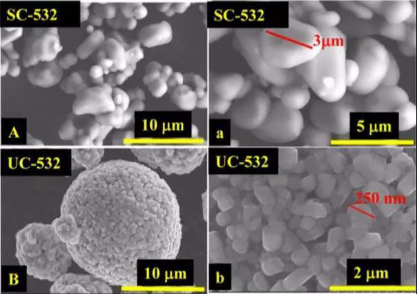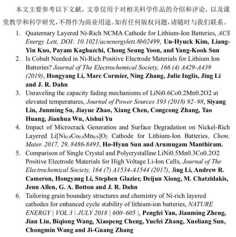 高鎳材料存在的這些問題嚴(yán)重制約了高容量電芯產(chǎn)品的發(fā)展,而單晶材料的出現(xiàn)了為高容量正極材料的開發(fā)打開一個(gè)嶄新的方向,所謂單晶材料是相對(duì)于傳統(tǒng)的二次顆粒材料而言的,傳統(tǒng)的NCM材料多為200-300nm的一次顆粒團(tuán)聚而成的二次顆粒,而單晶材料則直接由直徑2-5um的獨(dú)立晶體構(gòu)成,由于更高結(jié)晶度、更加穩(wěn)定的層狀結(jié)構(gòu)、各向異性特征,單晶材料無論是在循環(huán)性能,還是在熱穩(wěn)定性,以及產(chǎn)氣量等指標(biāo)上都要優(yōu)于傳統(tǒng)的二次顆粒NCM材料[5]。