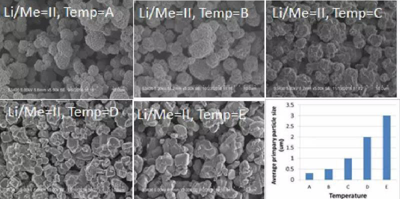 單晶材料制備的核心在于燒結(jié)工藝,其中溫度的控制是核心,溫度過低不利于晶體充分生長,過高則容易在材料內(nèi)部產(chǎn)生O缺陷,引起材料內(nèi)Li/Ni混排的增加,影響材料的性能。萬向的科學(xué)家們?yōu)榱舜龠M(jìn)晶體的生長,同時(shí)減少材料過燒的風(fēng)險(xiǎn),通過優(yōu)化配鋰量和燒結(jié)溫度,制備出結(jié)晶形態(tài)良好的高鎳單晶三元材料。