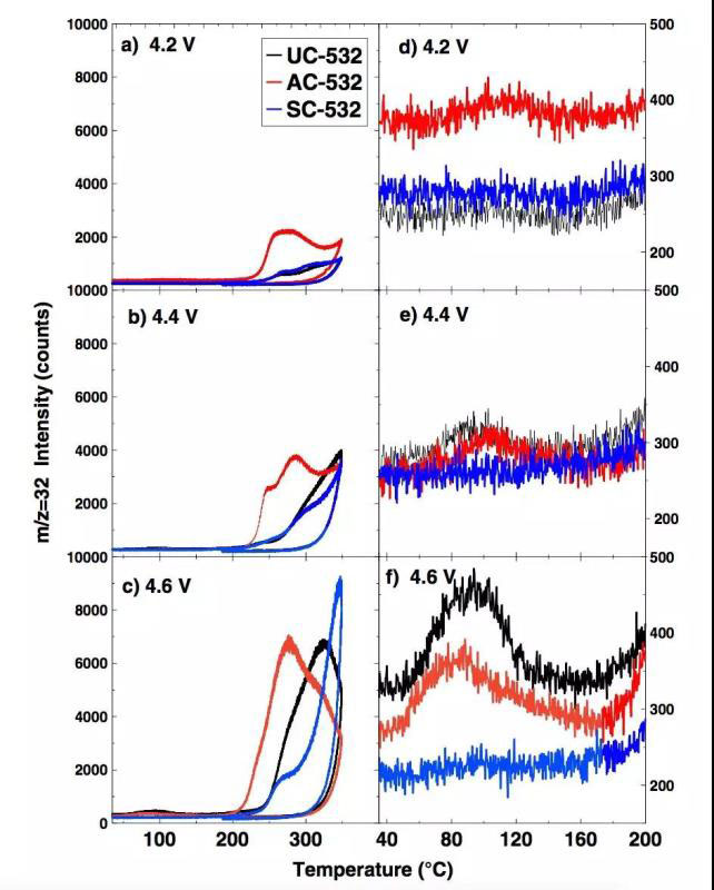 近期多起電動(dòng)汽車自燃事故,將電動(dòng)汽車的安全性問題推上了風(fēng)口浪尖,前面我們已經(jīng)介紹過隨著Ni含量的提高會(huì)導(dǎo)致材料的熱穩(wěn)定性下降,而單晶材料由于晶體結(jié)構(gòu)更加穩(wěn)定,因此熱穩(wěn)定性也會(huì)相應(yīng)提高,O2釋放量實(shí)驗(yàn)表明單晶NCM523材料不但在80℃附近沒有O2釋放,而且在200-350℃范圍內(nèi)的O2釋放峰的溫度也要高于二次顆粒NCM523材料[5],這也表明單晶材料在熱穩(wěn)定上具有一定的優(yōu)勢。