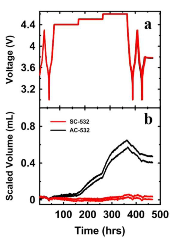 近年來,隨著動(dòng)力電池能量密度的持續(xù)提升,能量密度更高的軟包電池的市場份額也在逐年擴(kuò)大,相比于硬殼電池,軟包電池對(duì)于材料產(chǎn)氣更加敏感,因此產(chǎn)氣量也是衡量材料穩(wěn)定性的重要指標(biāo)之一。通過浮充實(shí)驗(yàn)?zāi)軌虬l(fā)現(xiàn),單晶材料產(chǎn)氣量非常小[5],在4.4V、4.5V和4.6V電壓下浮充100h的產(chǎn)氣量僅為0.01、0.01和0.04ml,而同樣條件下Al2O3包覆的二次顆粒NCM523材料電池的產(chǎn)氣量則分別達(dá)到了0.07、0.27和0.62ml,這再次表明單晶材料在產(chǎn)氣上具有較大的優(yōu)勢。