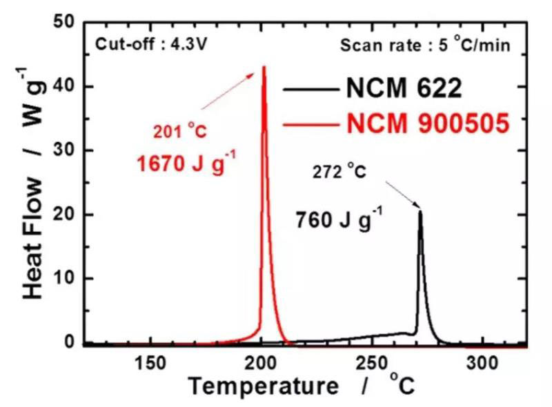 提高Ni含量也面臨同樣的問題,相比于NCM622材料,NCM900505材料的不僅循環(huán)性能大幅下降,在熱穩(wěn)定性上也出現(xiàn)了明顯的降低。在高電壓下NCM900505無論是在熱分解溫度,還是在放熱量方面也都要顯著差于NCM622材料[4],這對(duì)應(yīng)了高鎳材料在電芯中較差的安全性。