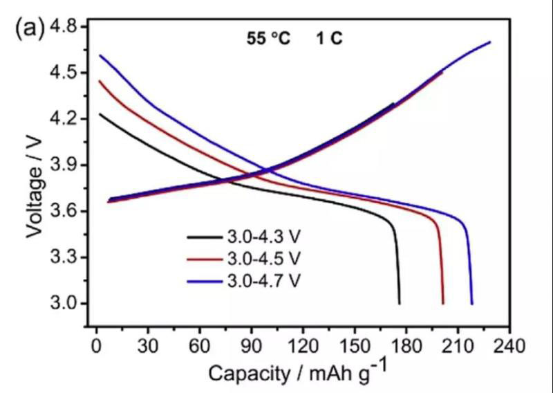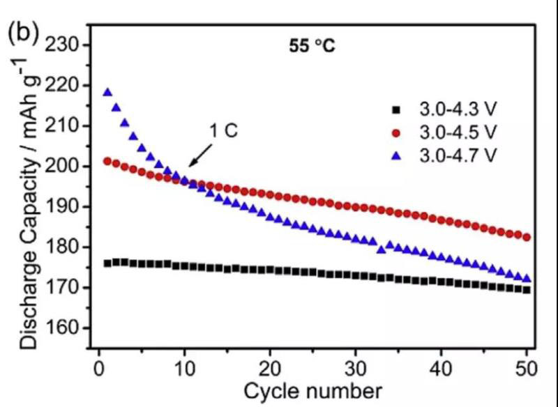 但是上述措施在提升正極材料容量的同時(shí)也會(huì)導(dǎo)致正極材料的循環(huán)性能和安全性能顯著的降低,以NCM622材料為例,雖然4.7V截止電壓可以為NCM622材料帶來接近220mAh/g的比容量,但是同時(shí)會(huì)導(dǎo)致材料的循環(huán)壽命嚴(yán)重退化。在55℃,半電池體系4.7V截止電壓下循環(huán)50次后,NCM622材料的容量保持率僅為78.9%,遠(yuǎn)低于4.3V下循環(huán)的NCM622材料(96.3%)[3],高電壓下的高鎳材料循環(huán)穩(wěn)定性面臨嚴(yán)峻的挑戰(zhàn)。