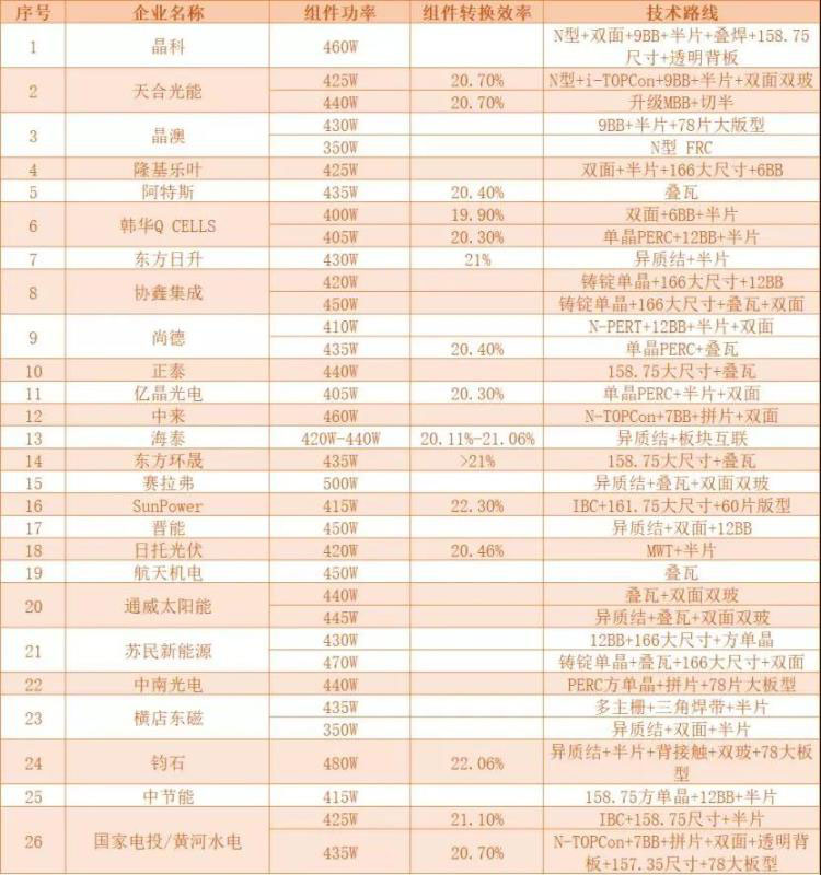 “組件輸出功率不斷攀高,但電池、組件轉(zhuǎn)換效率并無明顯突破”——這是小編今年逛完SNEC展最大的感受。從各家展出的產(chǎn)品來看,通過各種高效技術(shù)的疊加,功率400W以上的組件已屢見不鮮,詳情見下表。