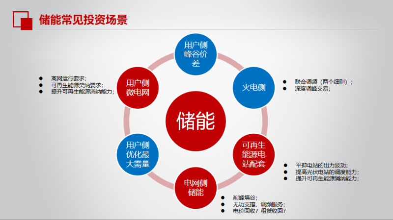 其中我標(biāo)藍(lán)色的是除了應(yīng)用場景以外也有明晰的回收機(jī)制的場景,比如對于用戶側(cè),峰谷價(jià)差,用儲能優(yōu)化最大容量,最大需量,減少需量電費(fèi)。而在一些好的地方政策下,比如峰谷電價(jià)比較好的省份,兩個(gè)調(diào)峰調(diào)頻細(xì)則比較好的省份,我們火電側(cè)的儲能應(yīng)用也是很有機(jī)會的。
