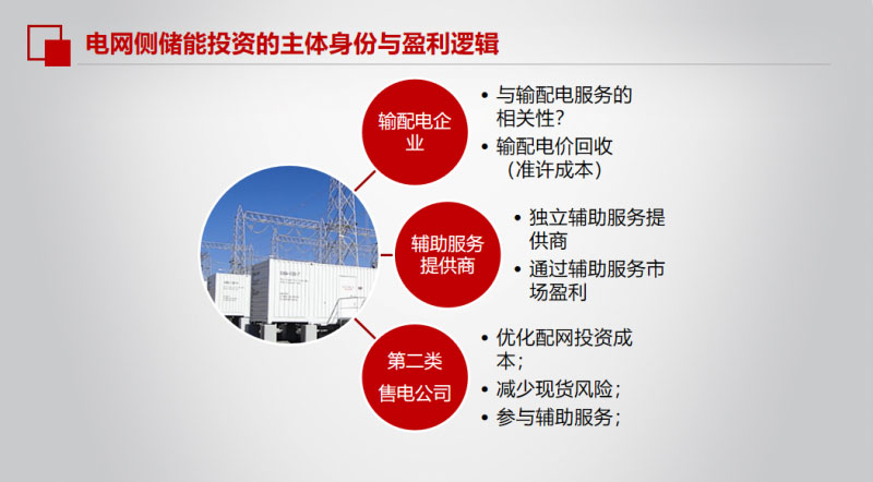 第二個(gè)是我們電網(wǎng)公司,這個(gè)是非常重要的一塊,當(dāng)然這里不僅僅只是我們傳統(tǒng)的國家電網(wǎng)公司或者南方電網(wǎng)公司的,應(yīng)該包括現(xiàn)在電改之后所有新的市場主體。第一個(gè)是輸配電企業(yè),這個(gè)時(shí)候我們在討論它的投資儲能的時(shí)候就有幾個(gè)問題出現(xiàn)了,第一個(gè)是我剛才說的我們投這個(gè)儲能是不是必需的?以鎮(zhèn)江項(xiàng)目為例,之前是因?yàn)橛幸恍┤紮C(jī)電廠上不了,我們電網(wǎng)公司為了保障供電安全上了儲能項(xiàng)目,這從技術(shù)上是毫無問題的。但是從輸配電相關(guān)性上可能會有一些疑問存在,為什么是投儲能而不是電源,如果說儲能是代替電源的作用,那能不能進(jìn)入電網(wǎng)輸配電價(jià)成本呢?這些問題會一直爭議下去,雖然簡單來看,我們的儲能跟輸配電的關(guān)系很模糊,但是儲能對于我們激勵(lì)減少輸配電投資來講還是有很大作用的。如果說我們認(rèn)同儲能可以進(jìn)入輸配電價(jià),也許可能對我們電網(wǎng)起到成本激勵(lì)的作用,可能會是件好事。