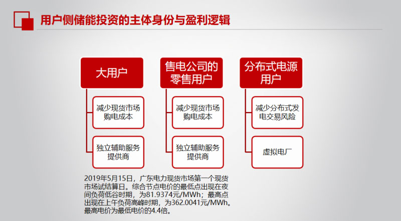 對于用戶側(cè)也有一些東西,我覺得還是變化很大的。第一個(gè)是大用戶,以后大用戶投儲能不是通過峰谷價(jià)差去回收,因?yàn)槟莻€(gè)沒有什么峰價(jià)和谷價(jià),價(jià)格都是波動的。那怎么辦呢?因?yàn)榇笥脩羰侵苯尤ナ袌鼋灰椎?,我們有儲能之后不是減少市場現(xiàn)貨交易的風(fēng)險(xiǎn),而是通過儲能去降低我們電力交易的成本,這就是我們的直接收益。