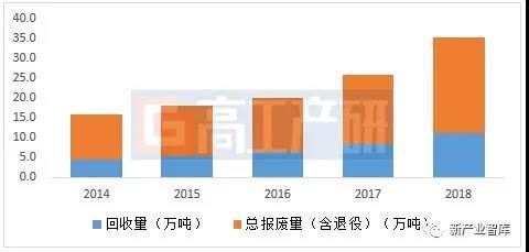 2014-2018年廢舊電池回收量及總報(bào)廢量(單位:萬噸)