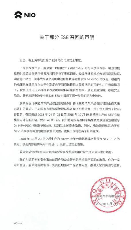 因為電池設計問題,蔚來汽車有限公司于6月27日針對部分ES8進行召回。作為ES8電芯的供應商,寧德時代發(fā)布了針對這次召回計劃的聲明,該公司表示:“對此事高度重視,將積極配合蔚來汽車的此次召回工作,維護消費者權益?!?