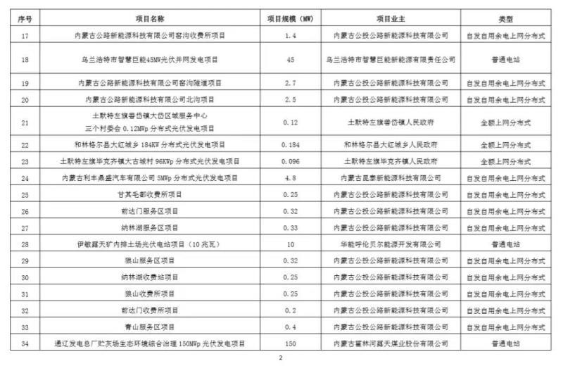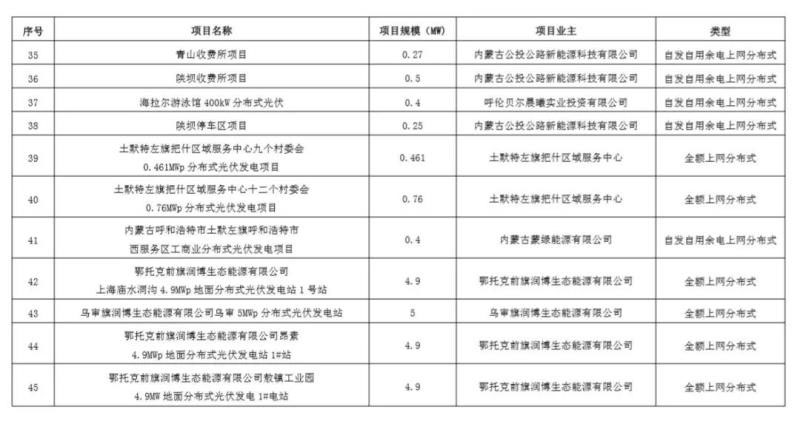 今日,內蒙古自治區(qū)公示了擬申報2019年光伏發(fā)電國家補貼的競價項目信息,一共45個光伏項目通過省級競爭配置方案,其中普通電站8個,全額上網分布式17個,自發(fā)自用余電上網分布式20個,總裝機規(guī)模合計449.34486MW,單體項目規(guī)模最高150MW,最低0.096MW,具體如下表。