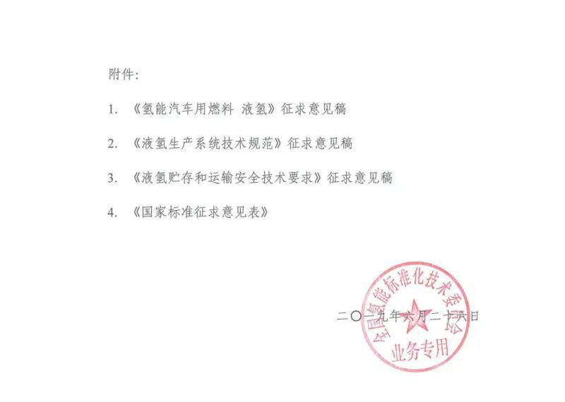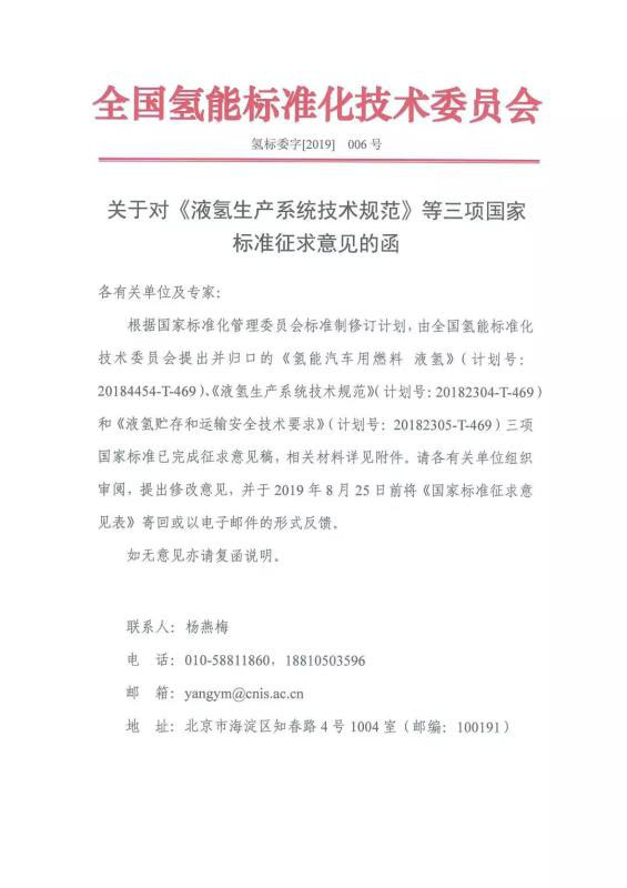 根據(jù)國家標(biāo)準(zhǔn)化管理委員會標(biāo)準(zhǔn)制修訂計(jì)劃,由全國氫能標(biāo)準(zhǔn)化技術(shù)委員會提出并歸口的《氫能汽車用燃料液氫》(計(jì)劃號:20184454-T-469)、《液氫生產(chǎn)系統(tǒng)技術(shù)規(guī)范》(計(jì)劃號:20182304-T-469)和《液氫貯存和運(yùn)輸安全技術(shù)要求》(計(jì)劃號:20182305-T-469)三項(xiàng)國家標(biāo)準(zhǔn)已完成征求意見稿,相關(guān)材料詳見附件。請各有關(guān)單位組織審閱,提出修改意見,并于2019年8月25日前將《國家標(biāo)準(zhǔn)征求意見表》寄回或以電子郵件的形式反饋。