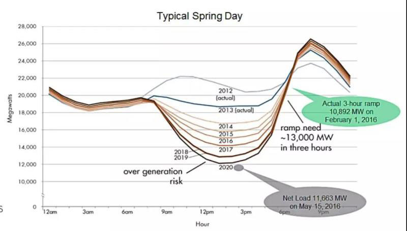 加州春季一天的鴨子曲線(凈負(fù)荷),正午容易發(fā)生過量生產(chǎn)。來源:CAISO, Flexible Resources Help Renewables Fast Facts