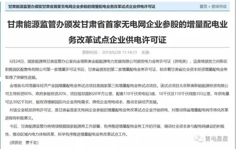 這是甘肅省頒發(fā)的第二家增量配電業(yè)務(wù)許可證,新奧金能是北京新奧新能能源投資有限公司主導投資80%、政府參股投資20%設(shè)立的。而北京新奧新能能源投資有限公司的主營業(yè)務(wù)是項目投資;銷售機械設(shè)備;節(jié)能、分布式能源及其他能源利用技術(shù)開發(fā)、技術(shù)咨詢、技術(shù)轉(zhuǎn)讓、技術(shù)推廣服務(wù);合同能源管理;新能源研發(fā);施工總承包;專業(yè)承包;工程勘察設(shè)計;經(jīng)濟信息咨詢(不含中介服務(wù));軟件開發(fā);租賃建筑工程機械設(shè)備;燃氣經(jīng)營;電力供應。并沒有擁有電網(wǎng)呢。