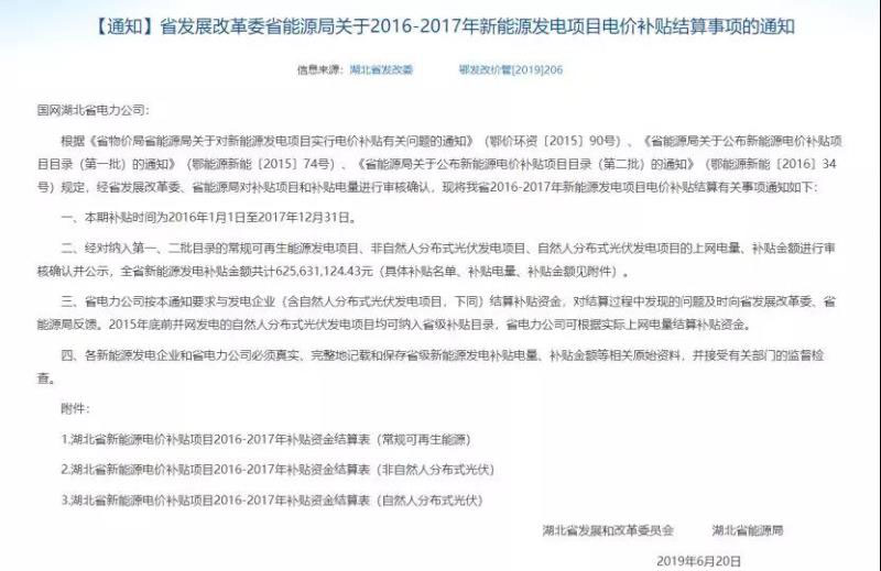 該《通知》經(jīng)對納入第一、二批目錄的常規(guī)可再生能源發(fā)電項目、非自然人分布式光伏發(fā)電項目、自然人分布式光伏發(fā)電項目的上網(wǎng)電量、補貼金額進行審核確認并公示,湖北全省新能源發(fā)電補貼金額共計625,631,124.43元。