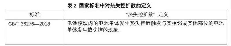 熱失控電池產(chǎn)生的熱量高于它可以消散的熱量時,熱量進一步積累,可能導致火災,爆炸和氣體釋放。如果電池系統(tǒng)中,由于一個電芯產(chǎn)生熱失控而引發(fā)其他電芯熱失控,即為熱失控擴散。國家標準GB/T 36276—2018中給出的熱失控擴散定義如表2所示。