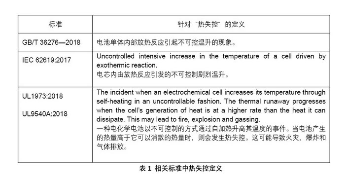 電化學電池以不可控制的方式通過自加熱升高其溫度的事故即為熱失控。目前,多個標準中都有針對熱失控的定義,見表1▼
