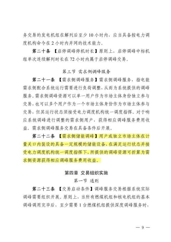 此外,在第二十二條還指出,【需求側(cè)儲能調(diào)峰】用戶或獨(dú)立市場主體在計(jì)量關(guān)口內(nèi)裝設(shè)的具備一定規(guī)模的儲能設(shè)備,在滿足運(yùn)行狀態(tài)并接受電力調(diào)度機(jī)構(gòu)統(tǒng)一調(diào)度指揮下,所提供的調(diào)峰資源可折算為需求側(cè)資源獲得相應(yīng)調(diào)峰服務(wù)費(fèi)用收益。