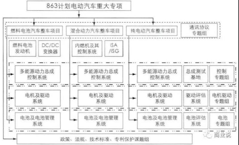 三縱是指插電式混合動力汽車、純電動汽車、燃料電池汽車;三橫是指多能源動力總成控制系統(tǒng)、電機(jī)及其控制系統(tǒng)和電池及其管理系統(tǒng)?!叭v”是不同階段的產(chǎn)業(yè)化目標(biāo),“三橫”則是實現(xiàn)不同階段產(chǎn)業(yè)化目標(biāo)的技術(shù)基礎(chǔ)。