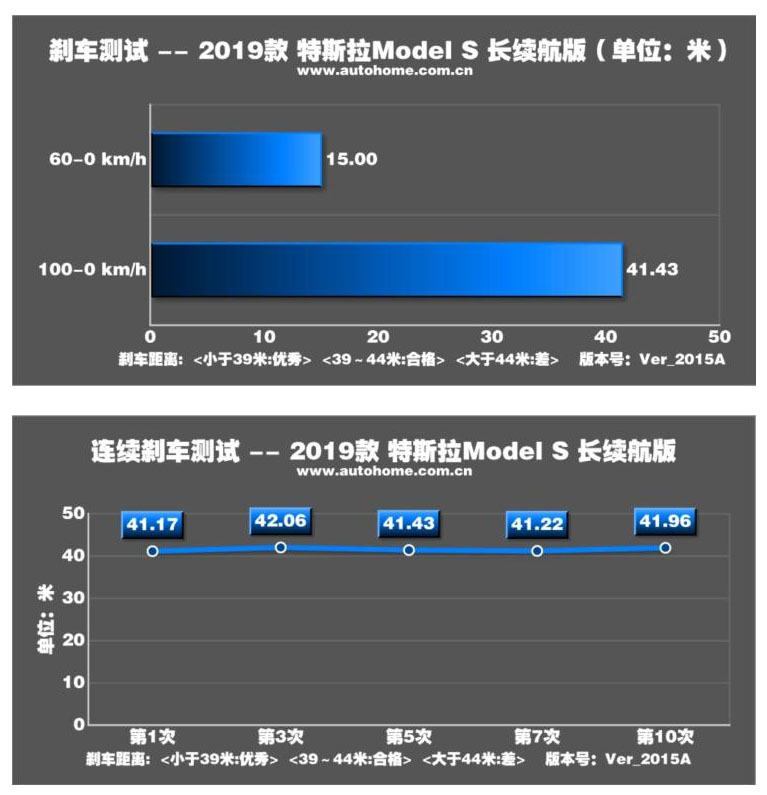 相較之下這臺車的制動表現(xiàn)比較一般,定位全季胎的固特異Eagle Touring在緊急制動狀態(tài)下抓地力略顯不足,再加上超過2噸的沉重車身帶來的巨大慣性,最終2019款特斯拉Model S長續(xù)航版100-0km/h的平均剎車成績?yōu)?1.43m;不過連續(xù)極限制動操作下,這臺車的制動成績卻沒有出現(xiàn)明顯衰減,還是穩(wěn)定的維持在41m-42m之間。