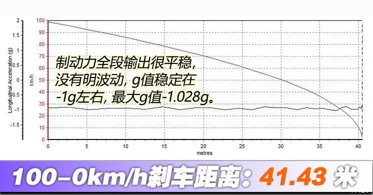 2、0-100km/h加速實測4.16s;100-0km/h制動實測41.43m;