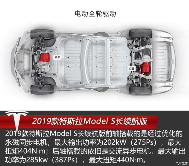 2019款特斯拉Model S長續(xù)航版前軸搭載的是一臺經(jīng)過優(yōu)化的永磁同步電機,最大輸出功率為202kW(275Ps),最大扭矩404N·m;后軸搭載的依舊是交流異步電機,最大輸出功率為285kw(387Ps),最大扭矩440N·m;與電動機匹配的是固定齒比的單速變速箱;電池包電量依舊為100kWh,被平鋪于車輛底部,起到了降低車輛重心,提升行駛穩(wěn)定性的效果。