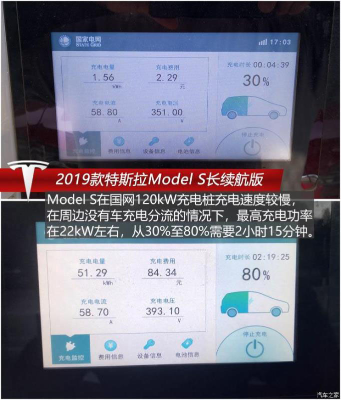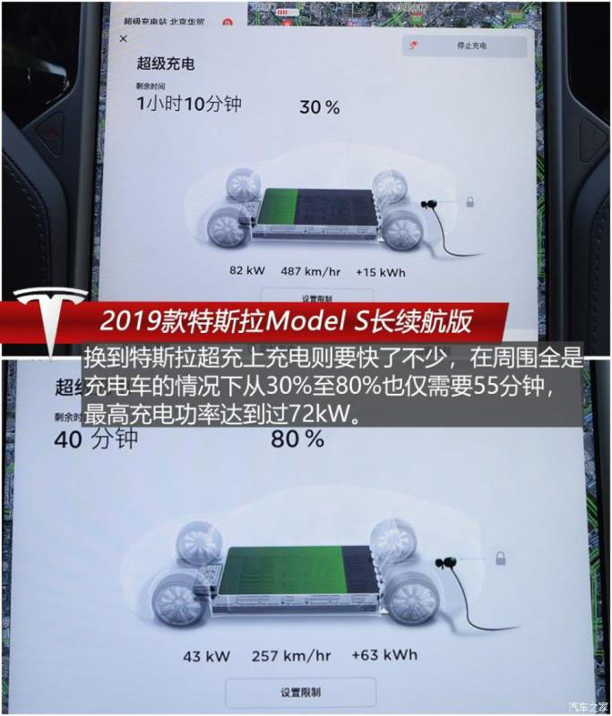 之后我們在國網(wǎng)直流120kW充電樁為Model S充電,不過在充電過程中我們發(fā)現(xiàn)這臺車與國網(wǎng)直流充電樁兼容性較差,充電速度遠低于在超級充電樁充電的速度,在周邊沒有什么車充電分流的情況下,最高充電功率也僅有22kW左右,從30%至80%需要2小時15分鐘,而且在兩處距離甚遠的國網(wǎng)充電站充電速度都差不多;換到特斯拉超充則要快了不少,在周圍全是充電車的情況下從30%至80%也僅需要55分鐘,最高充電功率達到過72kW。