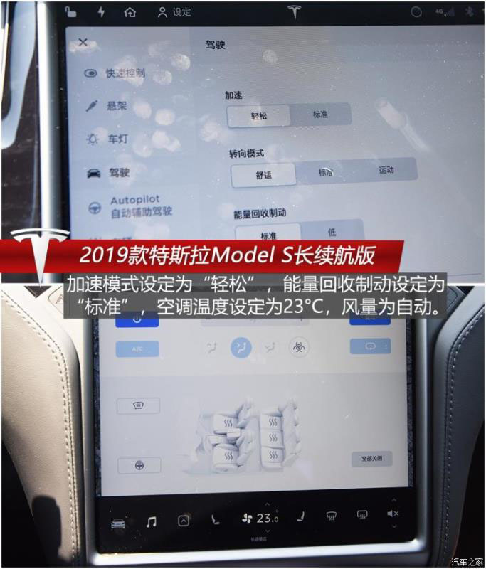 Model S的舒適性還體現(xiàn)在能量回收的設定上,同樣是兩擋設定,“低”擋位下松開加速踏板并不會有明顯的拖拽感,動能回收力度柔和細膩;“標準”模式下拖拽感及減速效果會更強,但也在可接受范圍內(nèi),不至于讓人有不適之感。