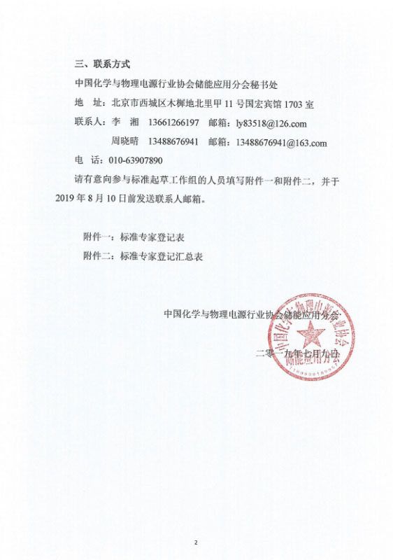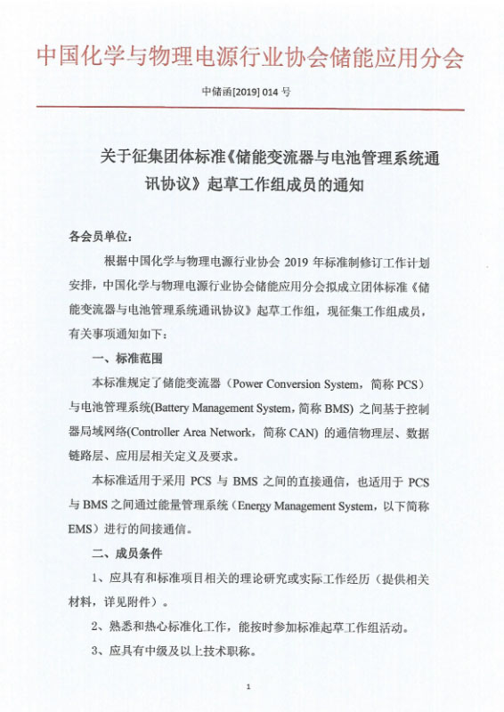 根據(jù)中國化學(xué)與物理電源行業(yè)協(xié)會2019年標(biāo)準(zhǔn)制修訂工作計劃安排,中國化學(xué)與物理電源行業(yè)協(xié)會儲能應(yīng)用分會擬成立團體標(biāo)準(zhǔn)《儲能變流器與電池管理系統(tǒng)通訊協(xié)議》起草工作組,現(xiàn)征集工作組成員,有關(guān)事項通知如下:
