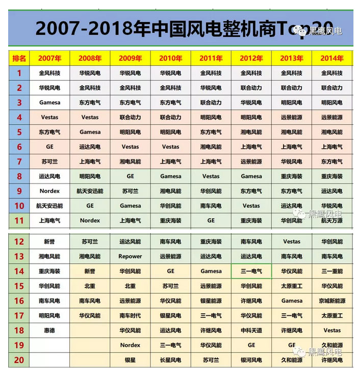 要跨越十五年的時(shí)間周期,理清整個(gè)中國(guó)風(fēng)電行業(yè)的競(jìng)爭(zhēng)變局,細(xì)枝末節(jié)已極難說(shuō)清。當(dāng)我們從歷年風(fēng)電整機(jī)商的具體排名變化,基本可以看到中國(guó)風(fēng)電市場(chǎng)競(jìng)爭(zhēng)格局、趨勢(shì)的大變化,如下表: