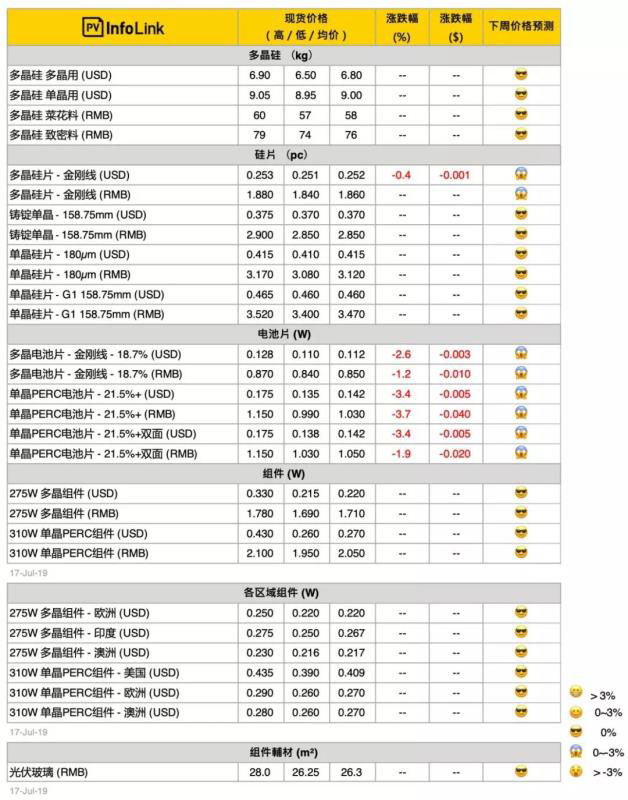 從本周報價來看,國內(nèi)終端需求依然沒有打開。隨著2019年競價名單的公布,國內(nèi)市場有望于8月開啟。