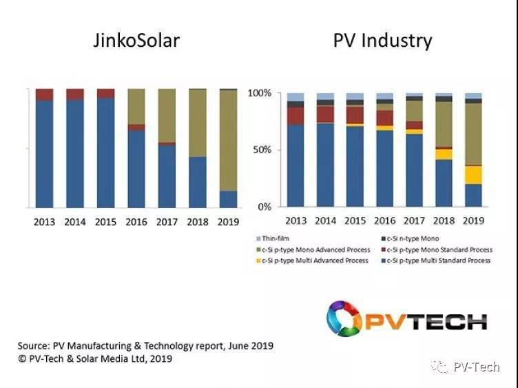 首先,讓我們來看看晶科能源的內(nèi)部電池技術(shù)變化并與整個(gè)行業(yè)(實(shí)際上是指電池生產(chǎn))進(jìn)行比較。最有效的辦法是審視2013年-2019年這七年間的c-Si/薄膜、p型/n型以及Al-BSF/鈍化工藝流程的分布情況。在下圖中,標(biāo)準(zhǔn)技術(shù)是 Al-BSF,先進(jìn)技術(shù)是 PERC。