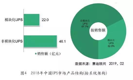 根據(jù)賽迪顧問(wèn)統(tǒng)計(jì),2018年中國(guó)中小功率UPS整體市場(chǎng)銷(xiāo)售額為20億元人民幣,較2017年下降了5.36%;2018年中國(guó)大功率UPS整體市場(chǎng)銷(xiāo)售額為48.1億元人民幣,與2017年相比獲得快速增長(zhǎng),同比增長(zhǎng)18.6%。從系統(tǒng)架構(gòu)來(lái)看,2018年模塊化UPS保持快速增長(zhǎng),占比進(jìn)一步增加,規(guī)模為22億元,與2017年相比增長(zhǎng)24.9%,份額達(dá)到整體UPS市場(chǎng)的32.3%。