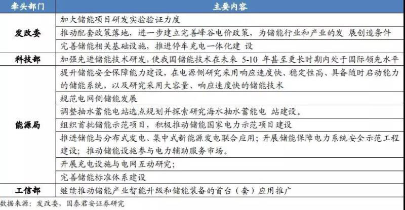 2019-2020 年行動計劃出臺,各部門各司其職保障儲能產(chǎn)業(yè)化應(yīng)用。2017年發(fā)改委等五部門聯(lián)合發(fā)布《關(guān)于促進儲能技術(shù)與產(chǎn)業(yè)發(fā)展的指導(dǎo)意見》,其中明確提到在十三五期間儲能產(chǎn)業(yè)發(fā)展進入商業(yè)化初期,十四五期間儲能儲能產(chǎn)業(yè)規(guī)?;l(fā)展。2019 年 7 月為進一步的貫徹落實該項指導(dǎo)意見,發(fā)改委等四部門發(fā)布 2019-2020 年行動計劃,其中對發(fā)改委、科技部、工信部、能源局的工作任務(wù)都做了詳細部署,進一步推進我國儲能技術(shù)與產(chǎn)業(yè)健康發(fā)展。