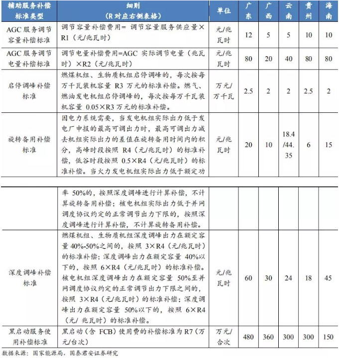 表 5:南方地區(qū)電力輔助服務(wù)補償機制