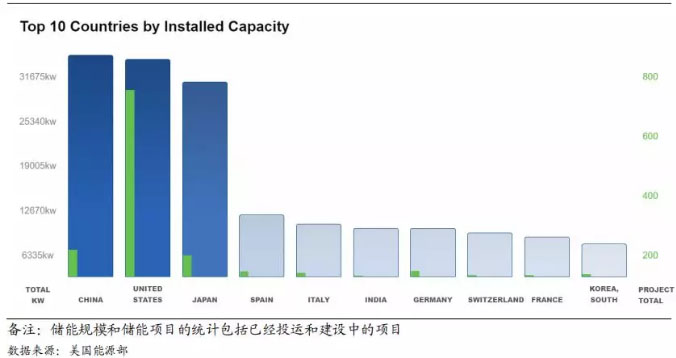 中國儲能裝機規(guī)模位列全球第一,美國、日本分列二三位。根據(jù)中關(guān)村儲能技術(shù)聯(lián)盟數(shù)據(jù)統(tǒng)計,中國裝機規(guī)模達到 31.3GW,占全球裝機總量17.3%,裝機規(guī)模位列全球第一。同樣的在美國能源部的統(tǒng)計中我們也可以看到從裝機規(guī)模來看中國位列全球第一(美國能源部統(tǒng)計的裝機規(guī)模包括已經(jīng)投運的項目和在建的項目),美國裝機規(guī)模位列全球第二,但其儲能項目數(shù)量位列第一。日本市場盡管其國土面積較小,但其整體裝機規(guī)模同樣在 30GW 左右,位列全球第三;西班牙、意大利、印度、德國、瑞士、法國、韓國分別四至十名,但與前三名相比裝機規(guī)模存在顯著差距。