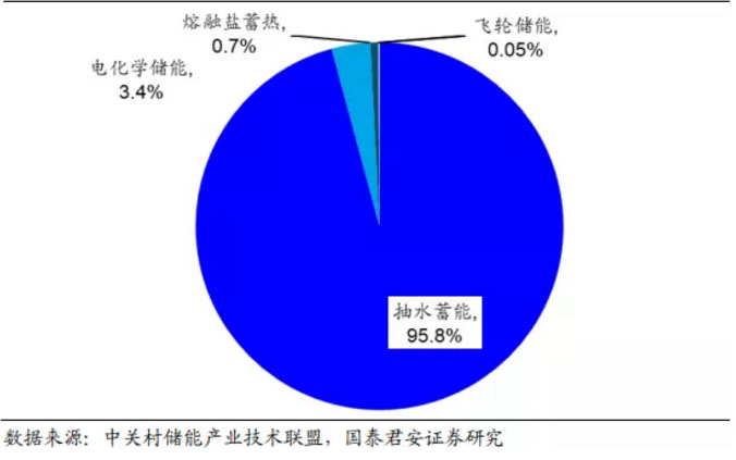中國市場與全球類似,抽水蓄能占據(jù)主導(dǎo)地位。在儲能裝機的類型分布中,我國呈現(xiàn)與全球類似的特點,根據(jù) CNESA 數(shù)據(jù)統(tǒng)計顯示,截止 2018年底我國儲能整體裝機中抽水蓄能占比達到 95.8%,電化學(xué)儲能與其他儲能方式共存,其中電化學(xué)儲能市場占比為 3.4%,熔融鹽蓄熱儲能市場占比 0.7%,而飛輪儲能,壓縮空氣儲能市場占比均不足 0.1%。