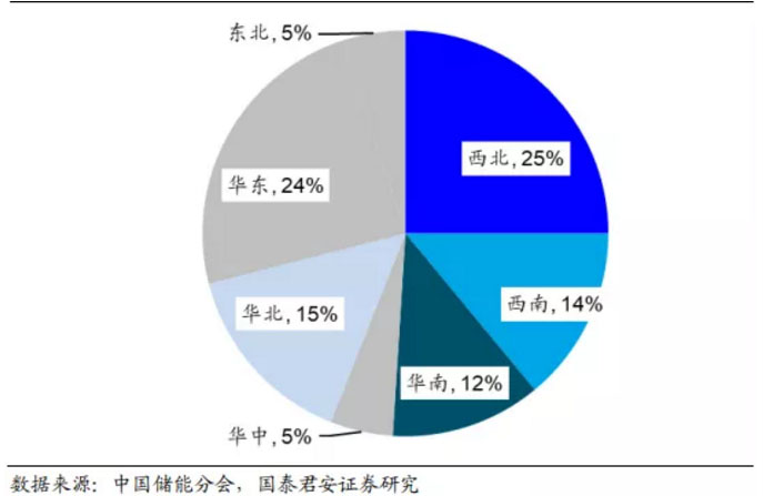 根據(jù)中國儲能分會數(shù)據(jù)顯示,我國儲能裝機主要分布在西北和華東地區(qū),兩者合計占裝機總規(guī)模的49%;其中西北地區(qū)主要集中在新疆、甘肅省,華東地區(qū)主要集中在江蘇、浙江等省份。此外西南、華南、華北地區(qū)儲能裝機估摸占比分別為 14%、12%及 15%;其中西南地區(qū)主要集中在云南省,華南地區(qū)集中在廣東省,華北地區(qū)則主要集中在山東、山西和內(nèi)蒙古等省份。華中及東北地區(qū)的儲能裝機量極少,占比均為 5%,其儲能裝機主要集中在湖南省、遼寧省。
