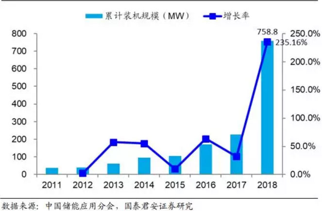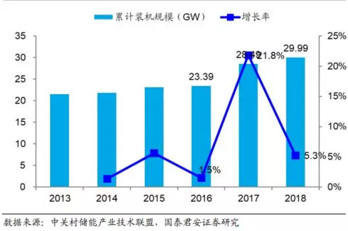 儲能產(chǎn)業(yè)興起較早且發(fā)展穩(wěn)定,截止 2010 年底儲能累計裝機規(guī)模已經(jīng)達到 135GW;2010-2015 年期間的由于受到整體經(jīng)濟低迷影響,整體裝機量增速放緩, 截止 2015 年累計裝機規(guī)模達到 144.8GW;2016-2018 年由于受到成本下降和政策推動的雙重刺激,儲能行業(yè)快速發(fā)展,截止 2018 年底累計裝機規(guī)模達到 179.1GW。