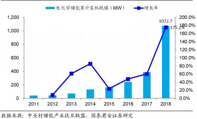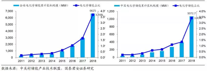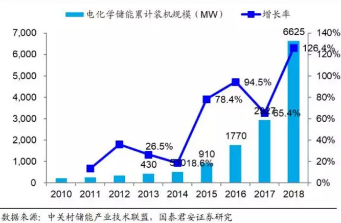 電化學(xué)儲能是儲能市場保持增長的新動力。無論是從全球還是中國的裝機情況來看,2018 年都可以說是電化學(xué)儲能的元年,亦或是集中爆發(fā)的一年。從全球角度來看,2018 年電化學(xué)儲能裝機規(guī)模達到 6625MW,同比增長 126.4%;占儲能市場裝機規(guī)模比重從 2017 年 1.67%提升到 2018 年的 3.70%。從中國市場來看,2018 年我國電化學(xué)儲能裝機規(guī)模達到1072.7MW,同比增長 175.2%;占我國儲能市場裝機估摸比重從 2017 年1.35%提升到 2018 年的 3.43%。我們認為隨著電化學(xué)儲能技術(shù)的不斷改進,電化學(xué)儲能系統(tǒng)的制造成本和維護成本不斷下降、儲能設(shè)備容量及壽命不斷提高,電化學(xué)儲能將得到大規(guī)模的應(yīng)用,成為中國儲能產(chǎn)業(yè)新的發(fā)展趨勢。根據(jù)中關(guān)村儲能產(chǎn)業(yè)技術(shù)聯(lián)盟數(shù)據(jù)預(yù)測,到 2020 年我國電化學(xué)儲能市場占比將進一步從 2018 年的 3.43 提高到 7.3%。