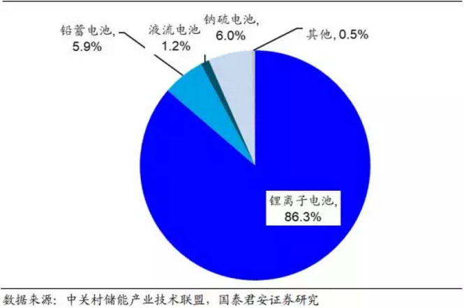 鋰離子電池在全球電化學(xué)儲能市場占據(jù)主導(dǎo)地位。截止 2018 年底,電化學(xué)儲能裝機量達到 1072.7MW,其中鋰離子電池儲能方式占據(jù)主導(dǎo)地位,占比高達 86%;鈉硫電池和鉛蓄電池分別占比 6%、5.9%;其他儲能方式作為電化學(xué)儲能多元發(fā)展的一部分,占比僅為 1.8%,且大多為示范性工程,如超級電容僅在美國建設(shè)有示范性儲能電站。