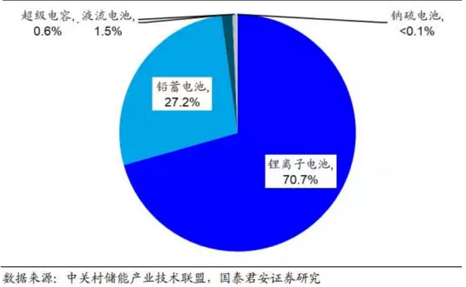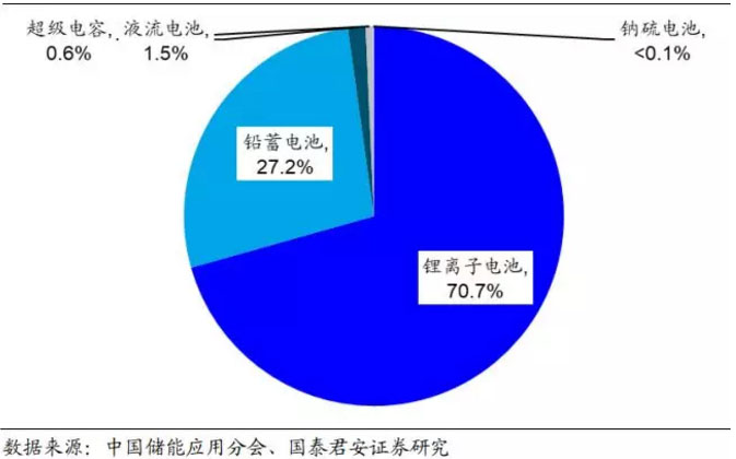 中國電化學(xué)儲能市場以鋰離子電池儲能為主導(dǎo),鉛蓄電池儲能是重要組成部分。在 2018 年中國電化學(xué)儲能新裝機分布中,鋰離子電池以 70.6% 的裝機占比占據(jù)主導(dǎo)地位;鉛蓄電池是電化學(xué)儲能市場的重要補充,新裝機量占比達到 27.2%;其余電化學(xué)儲能方式如液流電池、超級電容、鈉硫電池占比合計僅為 2.2%。