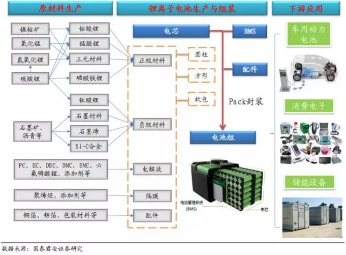 鋰離子電池應(yīng)用廣泛。與傳統(tǒng)電池相比,鋰離子電池不含鉛、鎘等重金屬,無污染、不含毒性材料,同時具備能量密度高、工作電壓高、重量輕、體積小等特點,已經(jīng)廣泛應(yīng)用于消費電子、新能源汽車動力電池和儲能領(lǐng)域。鋰離子電池電芯主要由正極材料、負極材料、電解液和隔膜四大材料構(gòu)成,而從電芯到最后的完整的電池包主要經(jīng)過兩個環(huán)節(jié):1) 將一定數(shù)量的電芯進行串并聯(lián)組裝成電池模組;2)電池模組加上熱管理系統(tǒng)、電池管理系統(tǒng)(BMS)以及一些結(jié)構(gòu)件組成完整的電池包,又稱作電池PACK。