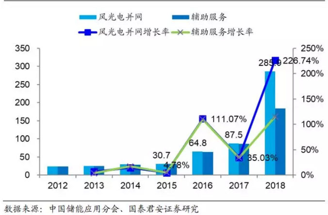 儲能技術(shù)在并網(wǎng)側(cè)的應(yīng)用主要是解決“棄光、棄風(fēng)”問題,改善電能質(zhì)量。我國能源供應(yīng)和能源需求呈逆向分布,風(fēng)能主要集中在華北、西北、東北地區(qū),太陽能主要集中在西部高原地區(qū),而絕大部分的能源需求集中在人口密集、工業(yè)集中的中、東部地區(qū);供求關(guān)系導(dǎo)致新能源消納上的矛盾,風(fēng)光電企業(yè)因為生產(chǎn)的電力無法被納入輸電網(wǎng),而被迫停機或限產(chǎn)。據(jù)國家能源局統(tǒng)計,我國棄光、棄風(fēng)率長期維持在 4%以上,僅2018 年棄風(fēng)棄光量合計超過 300 億千瓦時。鋰離子電池儲能技術(shù)能有效幫助電網(wǎng)消納可再生能源,減少甚至避免棄光棄風(fēng)現(xiàn)象的發(fā)生。風(fēng)光發(fā)電受風(fēng)速、風(fēng)向、日照等自然條件影響,輸出功率具有波動性、間歇性的特點,將對局部電網(wǎng)電壓的穩(wěn)定性和電能質(zhì)量產(chǎn)生較大的負面影響, 鋰離子電池儲能技術(shù)在風(fēng)光電并網(wǎng)的應(yīng)用主要在于平滑風(fēng)電系統(tǒng)的有功波動,從而提高并網(wǎng)風(fēng)電系統(tǒng)的電能質(zhì)量和穩(wěn)定性。