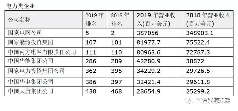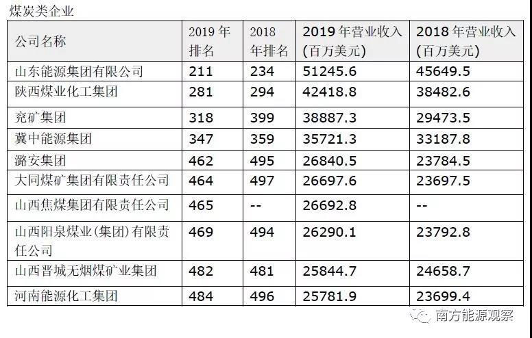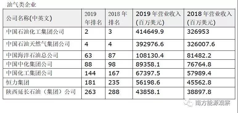 油氣類企業(yè)方面,中國(guó)石油天然氣集團(tuán)公司穩(wěn)居第四位;中國(guó)石油化工集團(tuán)公司、中國(guó)海洋石油總公司、中國(guó)中化集團(tuán)公司、中國(guó)化工集團(tuán)公司、恒力集團(tuán)、陜西延長(zhǎng)石油(集團(tuán))公司等6家公司有所上升,分別上升了1名、24名、10名、23名、54名、25名、42名。雖然排名和營(yíng)收較2018年有所提升,但中國(guó)化工集團(tuán)公司實(shí)際虧損22.076億美元,為本次上榜的中國(guó)能源企業(yè)中虧損最大的企業(yè)。