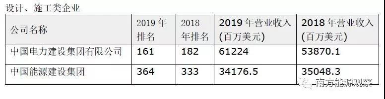 涉及能源設(shè)施設(shè)計(jì)、施工的企業(yè)中,中國(guó)電力建設(shè)集團(tuán)有限公司進(jìn)步了21名,排名第161;中國(guó)能源建設(shè)集團(tuán)排名較2018年后退了31名,排名第364,其2019年?duì)I業(yè)收入也較2018年少8.718億美元。
