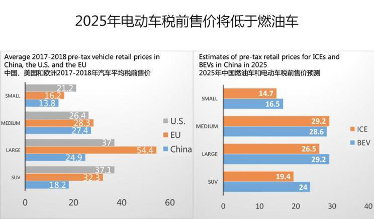 而彭博社《2019年新能源汽車長期展望報告》 則進一步驗證了兩位教授的觀點。報告稱,自2010年以來,在規(guī)模經(jīng)濟和技術進步的共同作用下,鋰離子電池每千瓦時的平均成本已下降了85%。到2025年左右,幾乎在所有主要市場電動車的購置成本和運行成本都將比燃油車(ICE)更便宜。下邊是彭博社的預測圖: