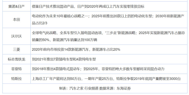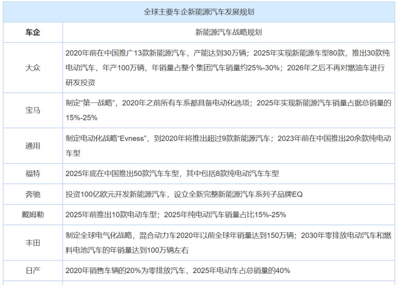 第三個是全球主要車企的新能源汽車發(fā)展規(guī)劃,國內(nèi)的這個就不列了,可以拍胸脯說,全部車企都有比國外要激進的新能源汽車規(guī)劃。各大車企都在快速推進電動化,而且不少國際企業(yè)迅速展開對中國市場的專門規(guī)劃。
